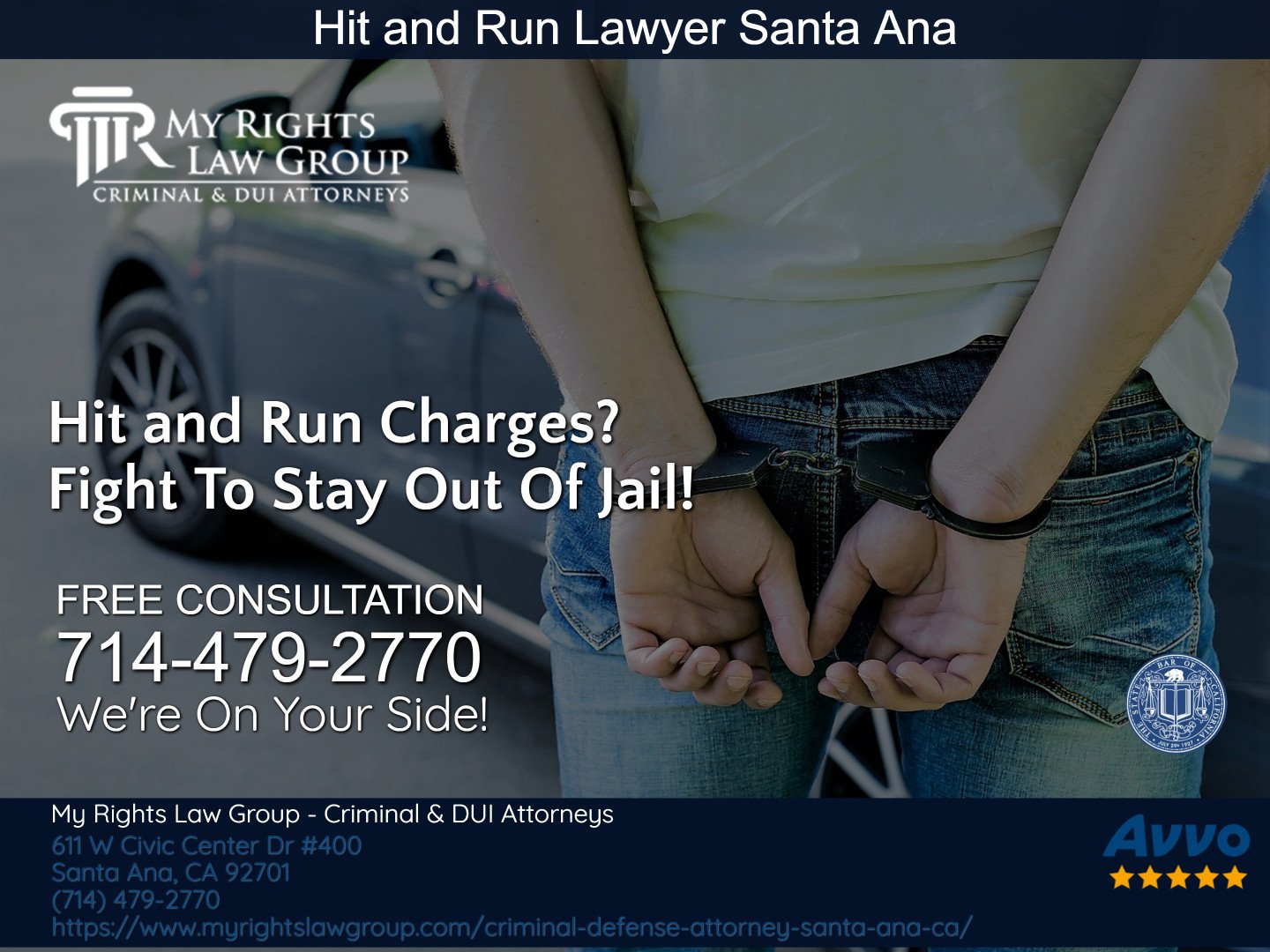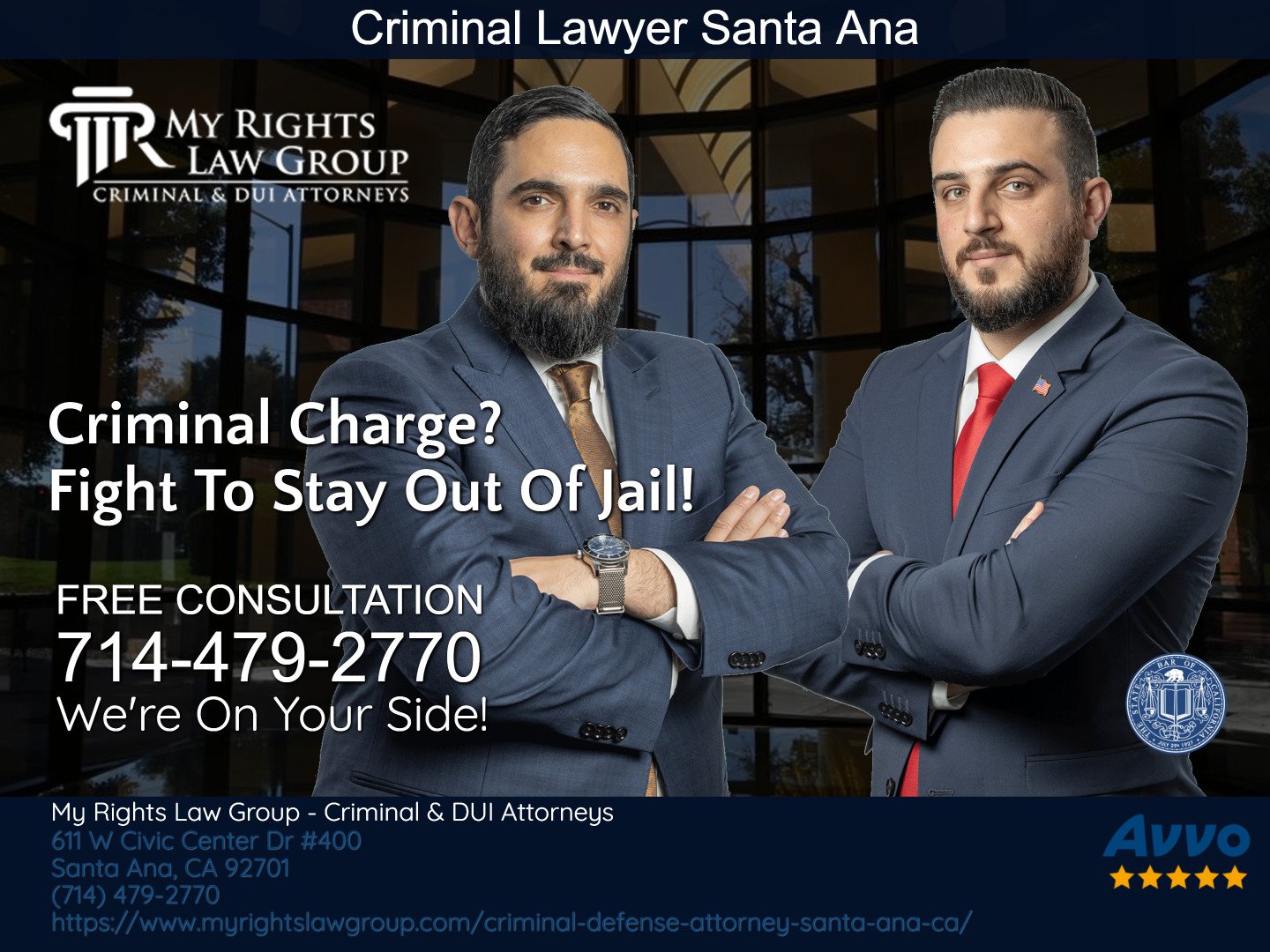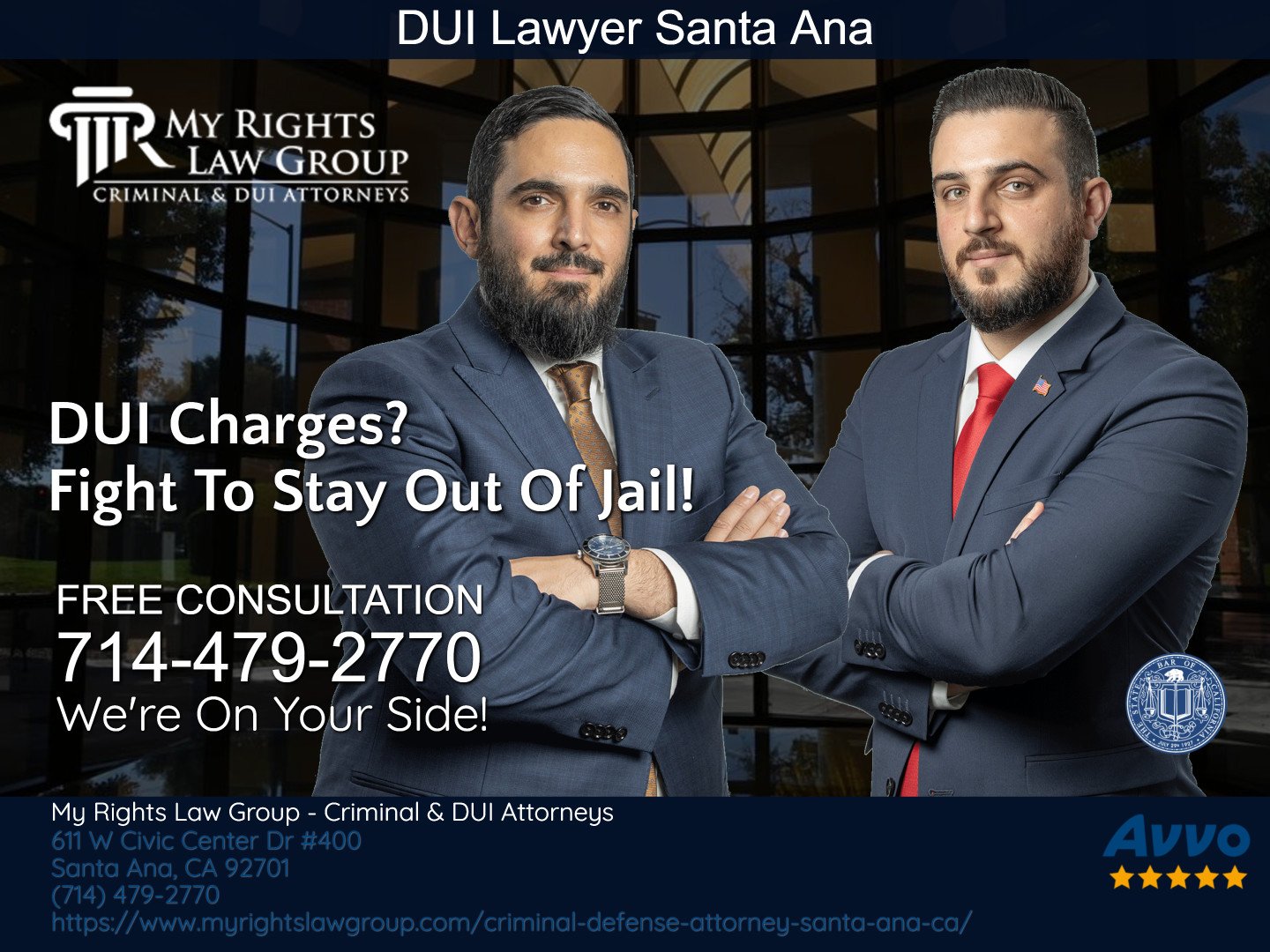 My Rights Law Group - Criminal & DUI Attorneys Santa Ana is a premier criminal law firm. Our skilled attorneys will argue in your place to obtain an acquittal, reduction or full dismissal of your criminal or DUI charges. Call us anytime for a FREE confidential, no-obligation strategy session. Around-The-Clock Help! Se Habla Español. Contact us at (714) 479-2770.