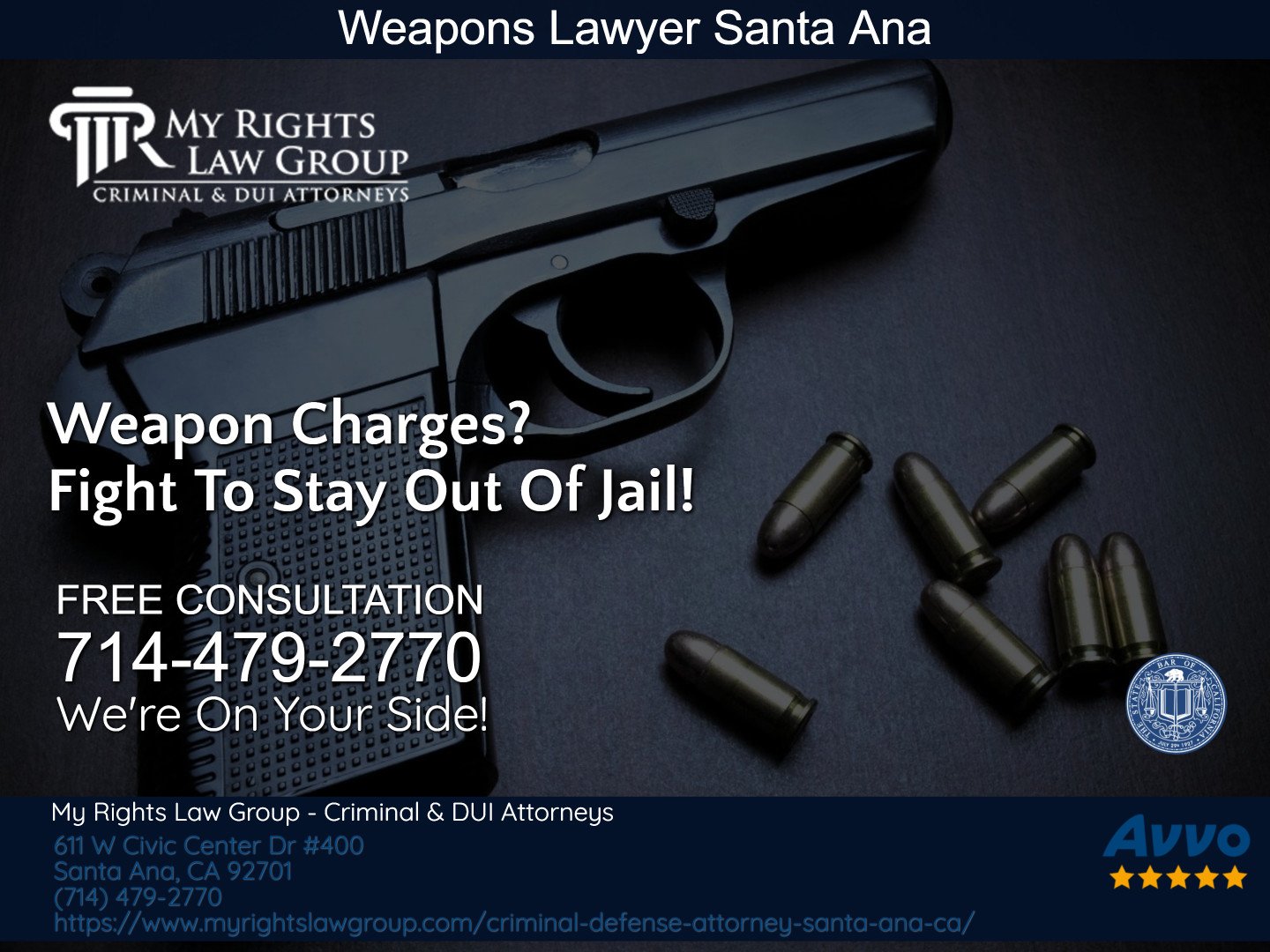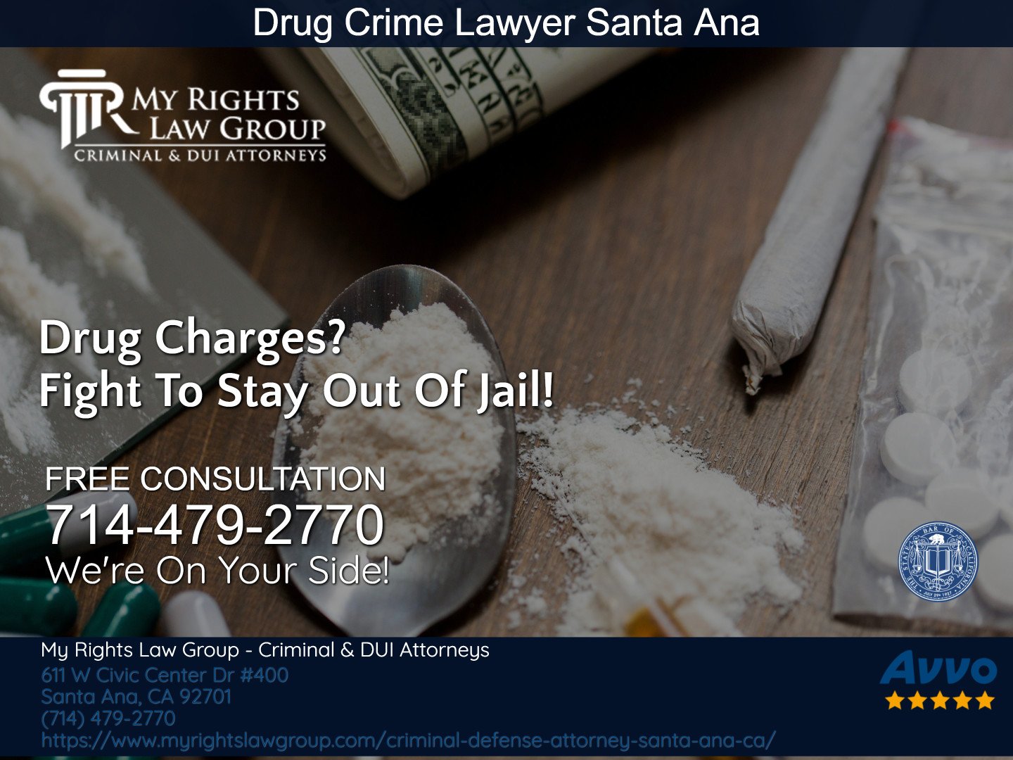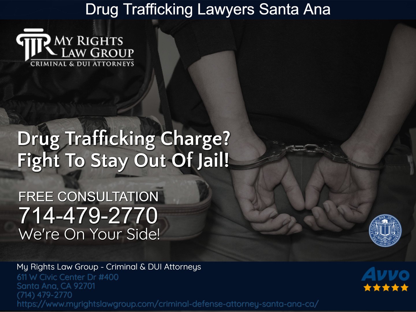 My Rights Law Group - Criminal & DUI Attorneys Santa Ana is a premier criminal law firm. Our skilled attorneys will argue in your place to obtain an acquittal, reduction or full dismissal of your criminal or DUI charges. Call us anytime for a FREE confidential, no-obligation strategy session. Around-The-Clock Help! Se Habla Español. Contact us at (714) 479-2770.